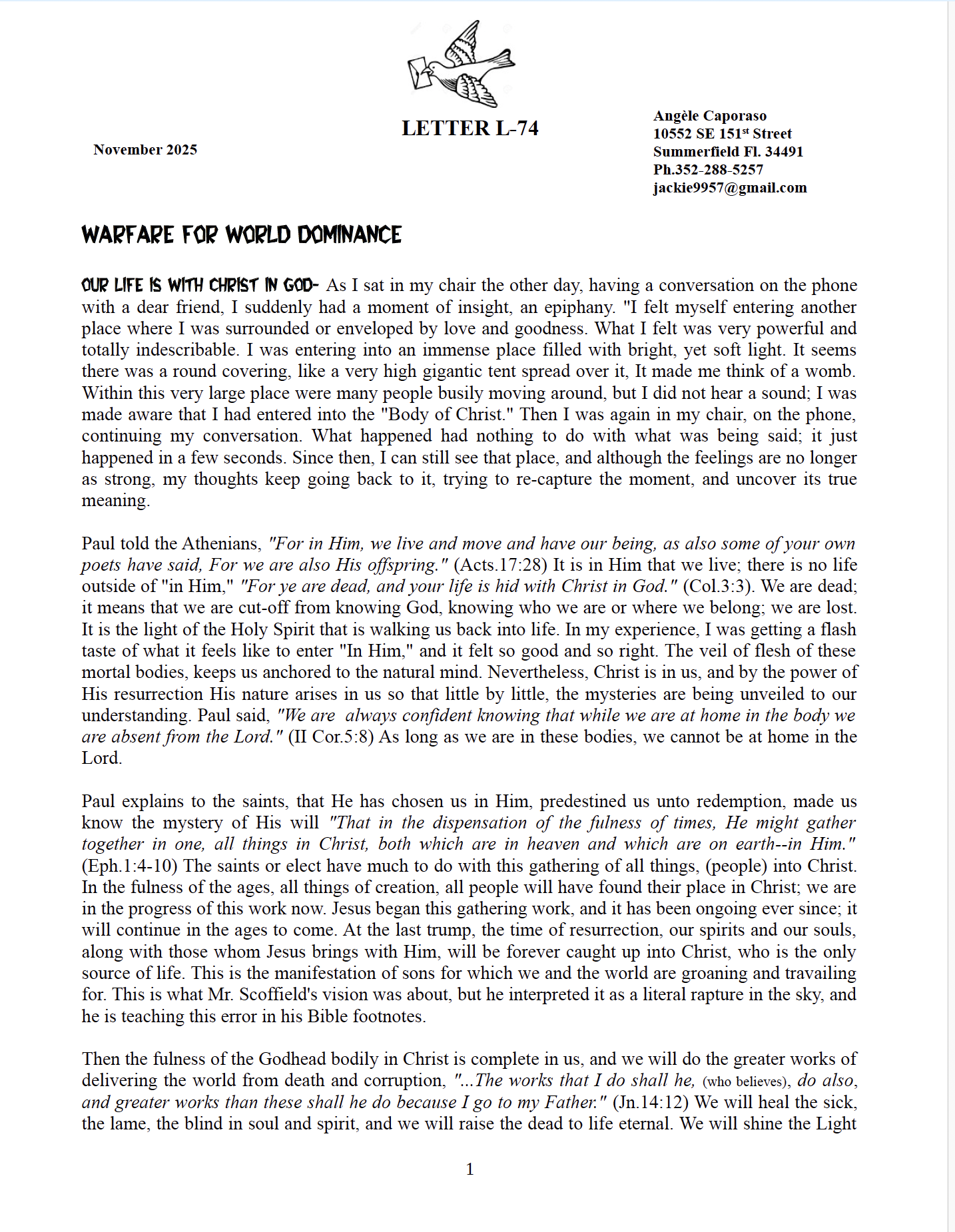 Jackie Caporaso is an inspiring friend who has been instrumental in the launching of Bible Concepts. Her writings are known as a current word that the Lord is speaking during this time of our transition from the old to the new creation in Christ. The Lord speaks frequently to her in dreams and has given her a keen sensitivity to understanding what the Spirit is speaking through them. The thread of her calling to this walk in Christ is found in the memoirs that are compiled in the book. Follow this thread and you’ll discover that the book is far more than the story of a young war bride that survived Nazi-occupied France.